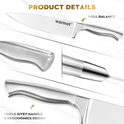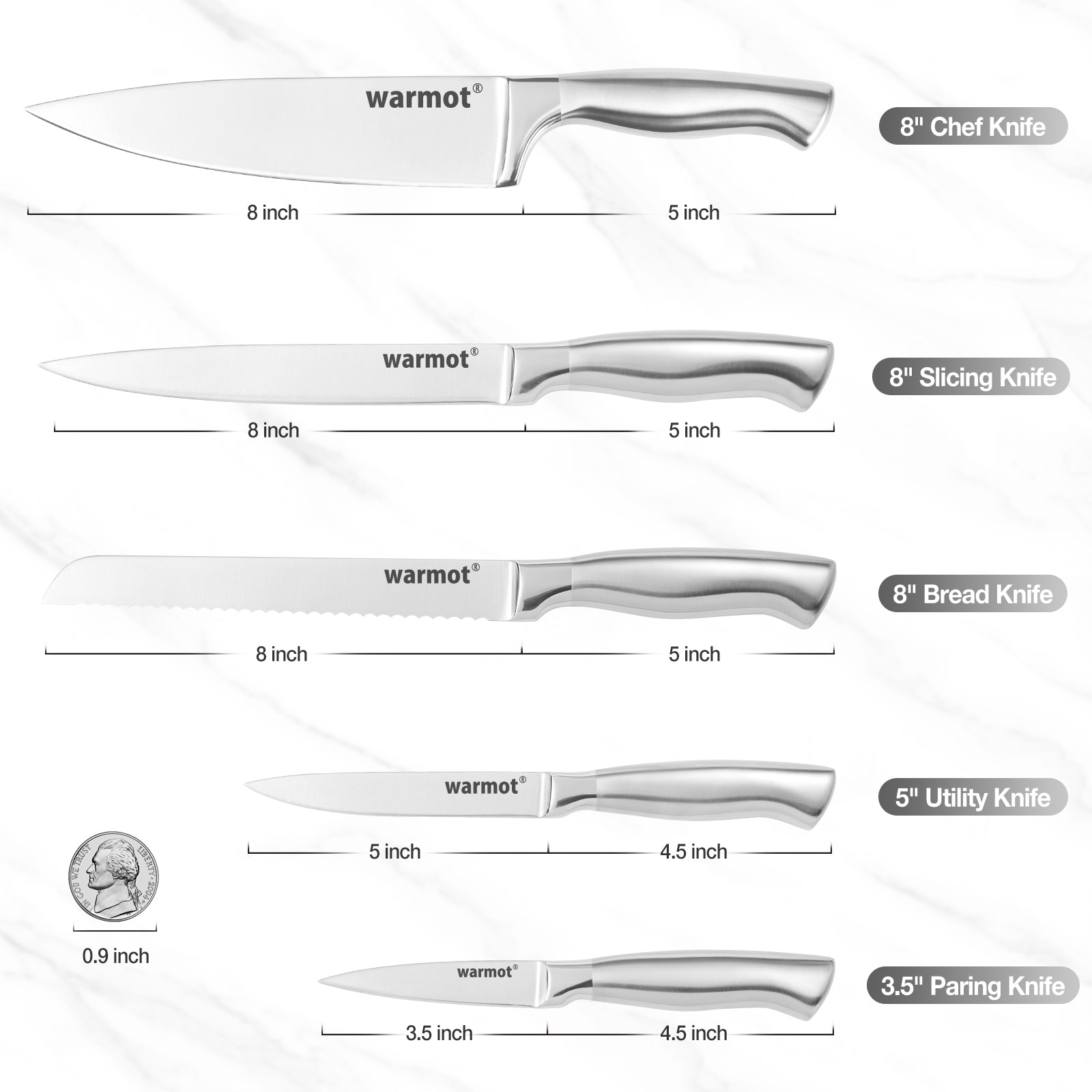 This is a perfect way to start a new knife set: 1x 8 chef knife, 1 x 8 slicing knife, 1 x 8 bread knife,1 x 5 utility knife, 1 x 3.5 paring knife. All-in-one knife sets for kitchen meets all kinds of needs of your kitchen.
