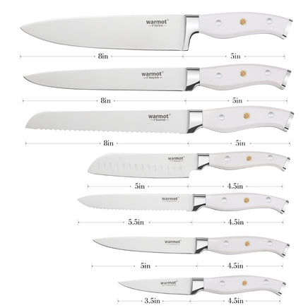 Color: 7-Pcs White Handle  Brand: warmot  Blade Material: German 1.4116 Stainless Steel  Blade Edge: Plain  Style: Ergonomic  8-inch Chef knife  1  8-inch Slicer knife  1  8-inch Bread knife  1  7-inch Santoku knife  1  5.5-inch Serrated utility knife  1  5-inch Utility knife  1  3.5-inch Paring knife  1