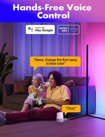 - Control your LED floor lamp with ease using voice commands via Alexa and Google Assistant, remote control, or control box. Enjoy 1-100% brightness adjustable, and easily switch up the light color to suit different moods. Set a timer to automatically turn the lighting on and off at a predetermined time.