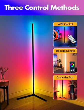 - Experience the ultimate in audio-visual entertainment with the Smart Floor Lamp. This corner light changes color and speed in sync with music or gaming audio for an immersive, real-scene experience. With the accompanying app, you can customize your favorite light color and adjust brightness and timing for a fun, relaxing atmosphere.