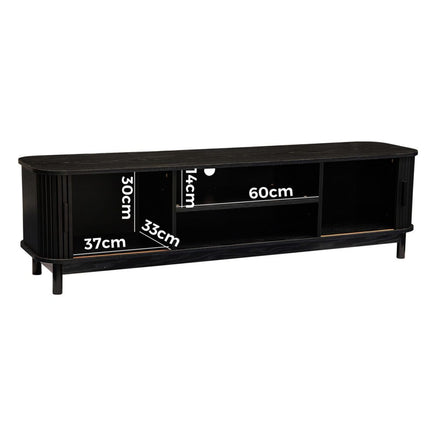 The TV Unit features a sophisticated ribbed look, elegant, curved frame, introduces a soft aesthetic to your living spaces. With 2 door storage and internal shelving with cable management holes, TV Unit provides ample storage for your entertainment needs.