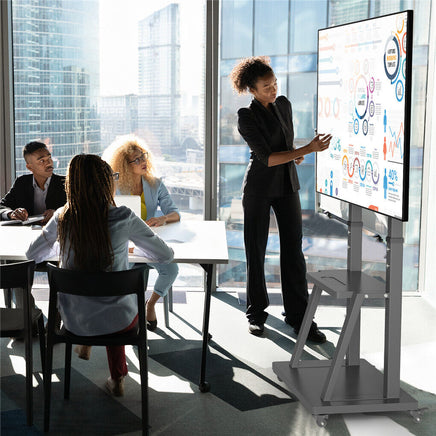 - Adjustable & Convenient: Easily adjust the height of the TV cart between 130cm and 160cm to suit various viewing preferences. The dual shelf design provides ample space for storing computers, DVD players, and other AV equipment, keeping everything you need at your fingertips.