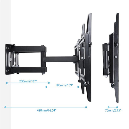This full-motion TV wall mount is designed to fit most 32"65" LED, LCD, Plasma, and flat-screen TVs. Built from heavy-duty SPCC cold-rolled steel, it supports up to 110 lbs, ensuring strong, secure, and long-lasting performance. The mount features tilt (±15), 90 swivel left and right, and an adjustable wall distance from 2.95" to 16.54", allowing you to achieve the perfect viewing angleeven in wall corners.