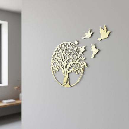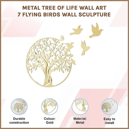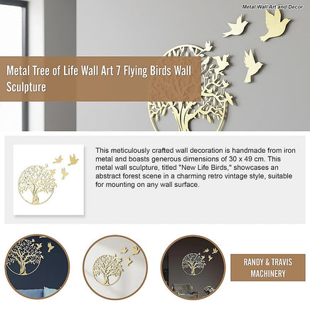 The Randy Travis Machinery metal wall sculpture portraying the Tree of Life encapsulates the interdependence of all living beings while making a profound visual statement on your wall. Seven airborne birds gracefully traverse the tree, aligning themselves in a mesmerizing aerial formation.