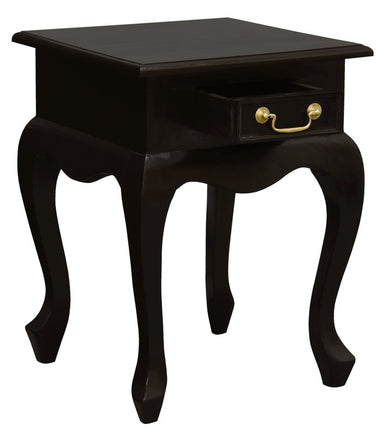 Embrace the sophistication of the Queen Anne 1 Drawer Lamp Tablea piece that pays homage to the elegance of traditional furniture design. Expertly crafted from solid mahogany timber, renowned for its strength and aesthetic appeal, this lamp table is detailed with brass hardware that adds a distinguished touch of luxury. Delivered fully assembled for your convenience, the Queen Anne lamp table measures 45 x 45 x 60 cm, providing an exquisite accent to any space without overwhelming it. Available in a selection of finishesChocolate, Light Pecan, Mahogany, White, and White Carameleach hue is chosen to highlight the natural beauty of the wood and complement your decor. The table's design is inspired by the graceful and romantic forms of the Queen Anne style, characterized by its curved lines and subtle ornamentation. The cabriole legs are a hallmark of the style, lending an air of antique charm and formality. The single drawer offers practical storage, making the table as functional as it is beautiful.