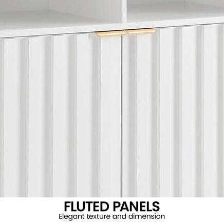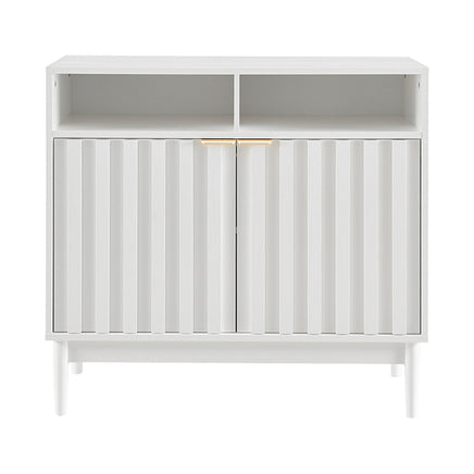 The Eleni sideboard is the perfect blend of elegance and rustic charm. With its modern farmhouse aesthetic, this 2-door cabinet features a sleek iron and oak effect finish. The fluted panels add a nice touch of sophistication and inside, youll find an adjustable shelf for great storage. Plus, the two open niches above the panel doors are just right for displaying your favourite decors or essentials. Supported by sturdy wood legs, this cabinet makes for a standout piece.