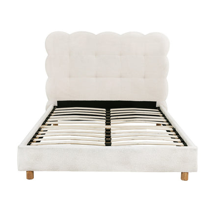 Artiss cloud headboard bed frame in white. Features boucle fabric upholstery and durable wood and metal construction. This platform base fits king single mattresses. Includes wooden slats and metal legs for strength. Easy to assemble. Supports up to 300KG. Note: Actual colour may vary.