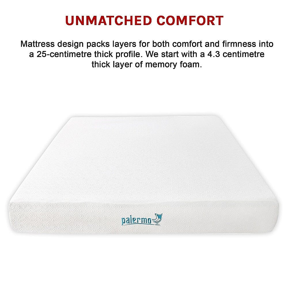 Sleep better every night with the Palermo King Gel Memory Foam Mattress, designed for comfort, support, and durability. Its 25cm dual-layer design combines plush memory foam with a high-density support base for balanced comfort and long-lasting strength.Over the top of the memory foam, we added the revolutionary OEKO-100 compliant blend fabric cover. It enhances breathability by creating an air layer while also reducing moisture.