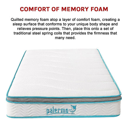 Welcome to the revolutionary comfort of the Palermo hybrid mattress. We quilted memory foam atop a layer of comfort foam, creating a sleep surface that conforms to your unique body shape and relieves pressure points. Then, we place this onto a set of traditional steel spring coils that provides the firmness that many need.