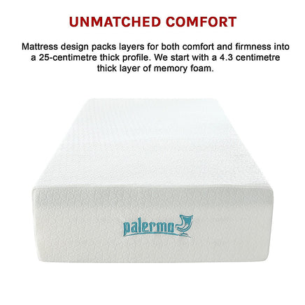 Sleep better every night with the Palermo King Single Gel Memory Foam Mattress, designed for comfort, support, and durability. Its 25cm dual-layer design combines plush memory foam with a high-density support base for balanced comfort and long-lasting strength.Over the top of the memory foam, we added the revolutionary OEKO-100 compliant blend fabric cover. It enhances breathability by creating an air layer while also reducing moisture.
