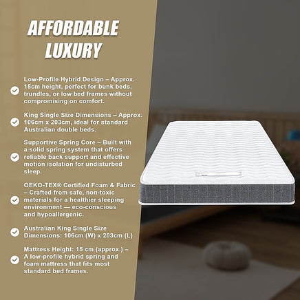 - Mattress Height: 15-17cm (approx.) A low-profile hybrid spring and foam mattress that fits most standard bed frames.