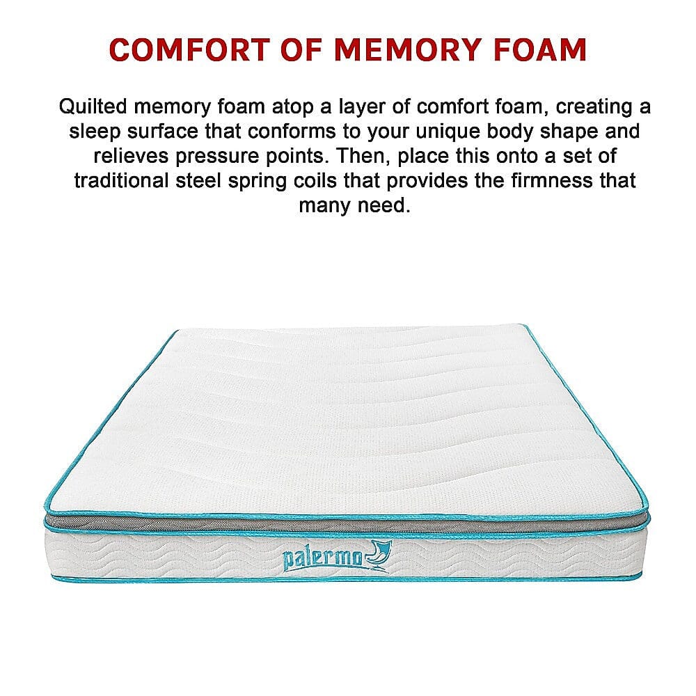 Welcome to the revolutionary comfort of the Palermo hybrid mattress. We quilted memory foam atop a layer of comfort foam, creating a sleep surface that conforms to your unique body shape and relieves pressure points. Then, we place this onto a set of traditional steel spring coils that provides the firmness that many need.
