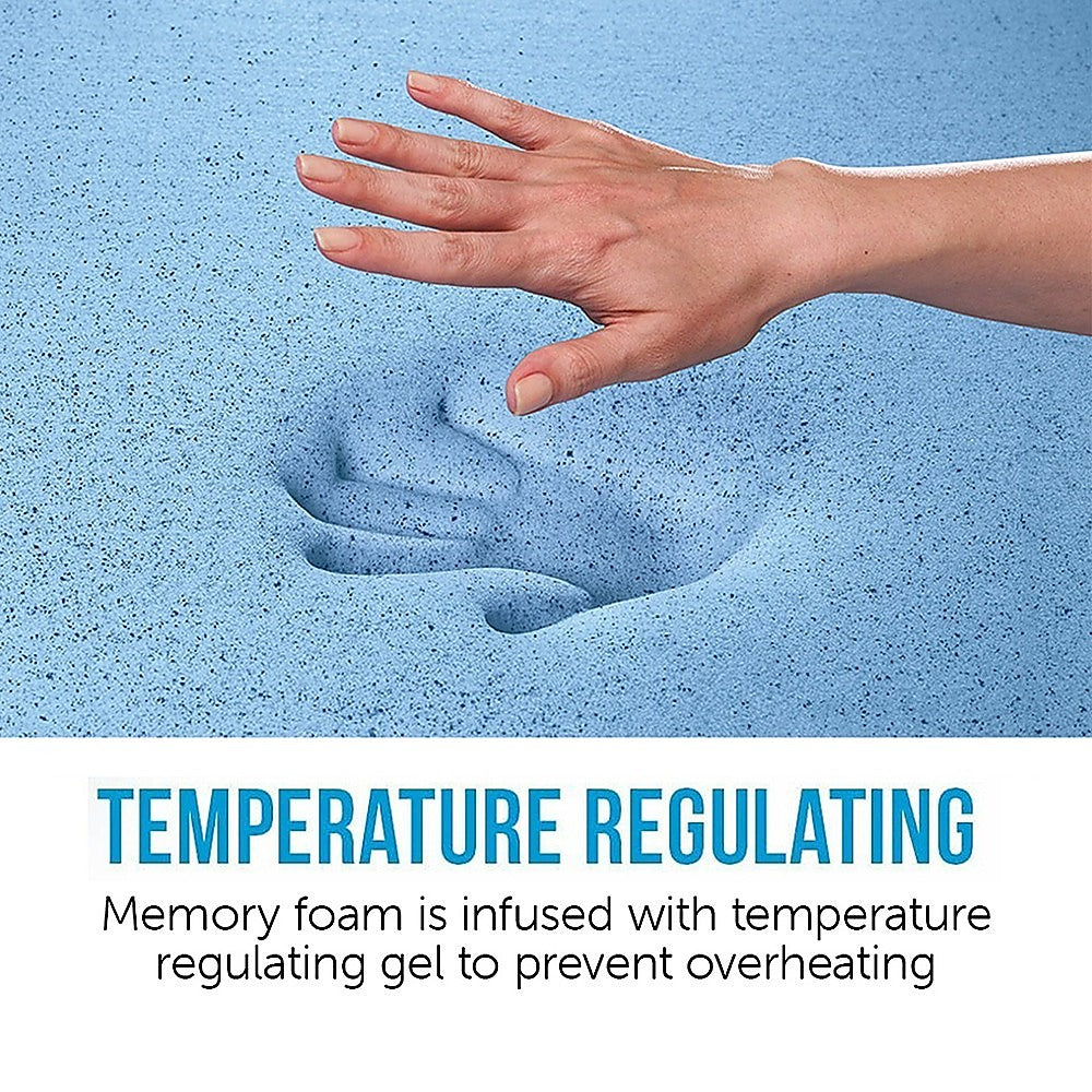 - Gel infused memory foam regulates temperature while conforming to the body to ease pressure points