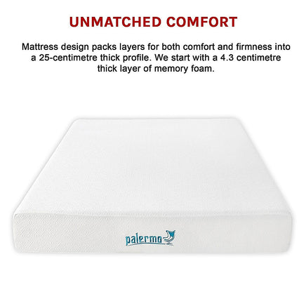 Sleep better every night with the Palermo Queen Gel Memory Foam Mattress, designed for comfort, support, and durability. Its 25cm dual-layer design combines plush memory foam with a high-density support base for balanced comfort and long-lasting strength.Over the top of the memory foam, we added the revolutionary OEKO-100 compliant blend fabric cover. It enhances breathability by creating an air layer while also reducing moisture.
