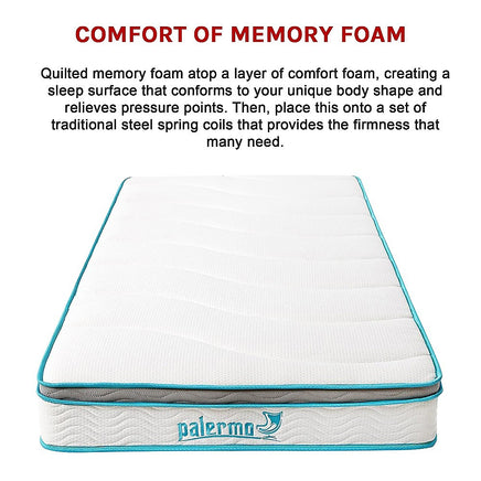 Welcome to the revolutionary comfort of the Palermo hybrid mattress. We quilted memory foam atop a layer of comfort foam, creating a sleep surface that conforms to your unique body shape and relieves pressure points. Then, we place this onto a set of traditional steel spring coils that provides the firmness that many need.