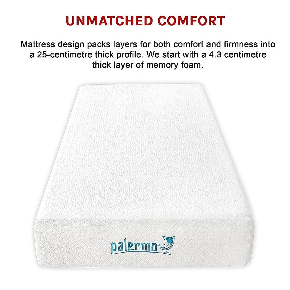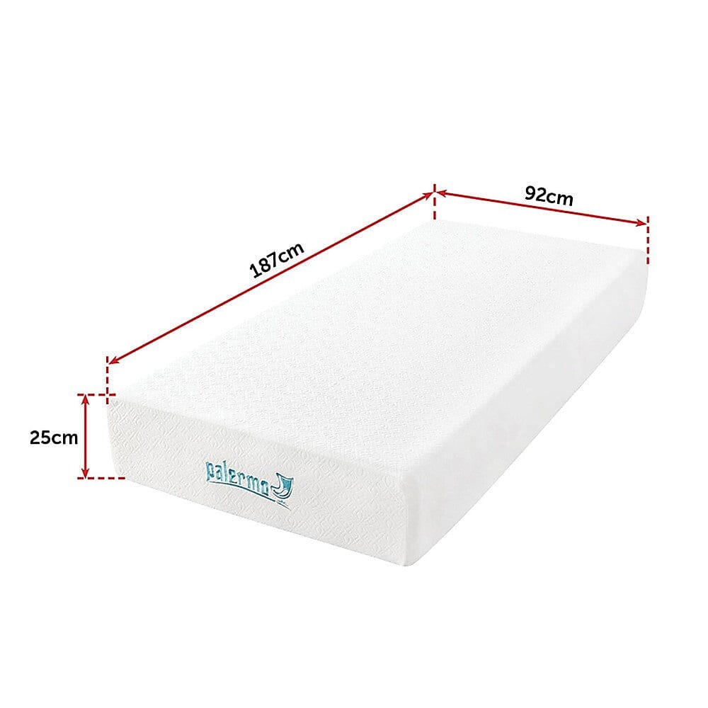 Sleep better every night with the Palermo Single Gel Memory Foam Mattress, designed for comfort, support, and durability. Its 25cm dual-layer design combines plush memory foam with a high-density support base for balanced comfort and long-lasting strength.Over the top of the memory foam, we added the revolutionary OEKO-100 compliant blend fabric cover. It enhances breathability by creating an air layer while also reducing moisture.