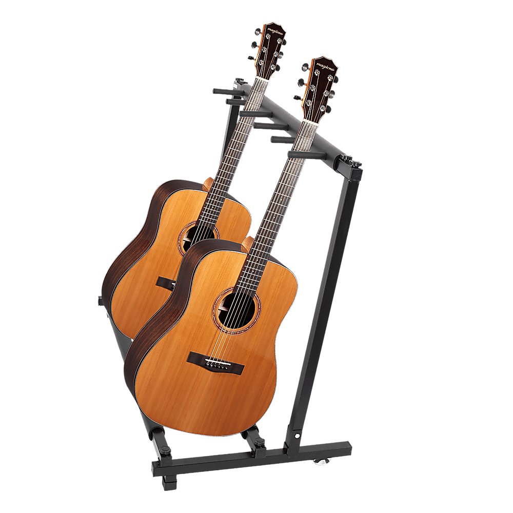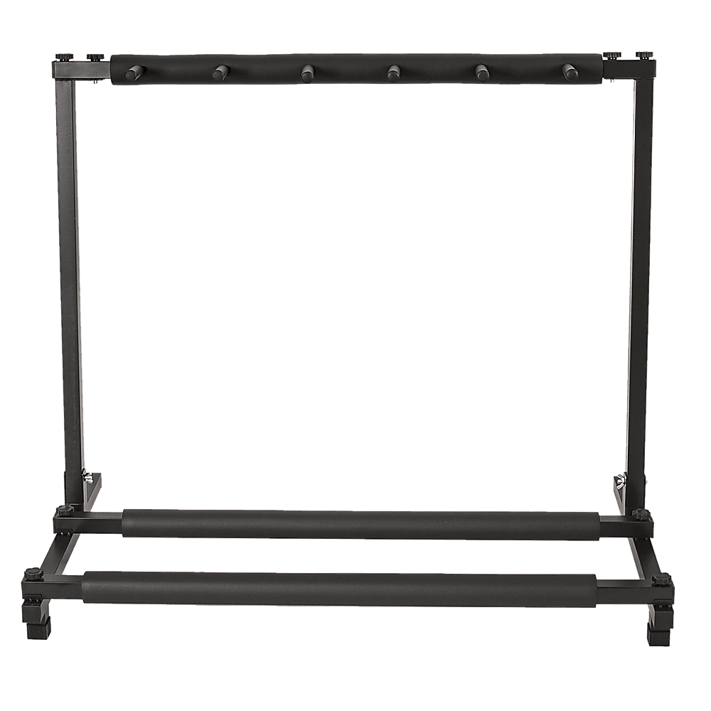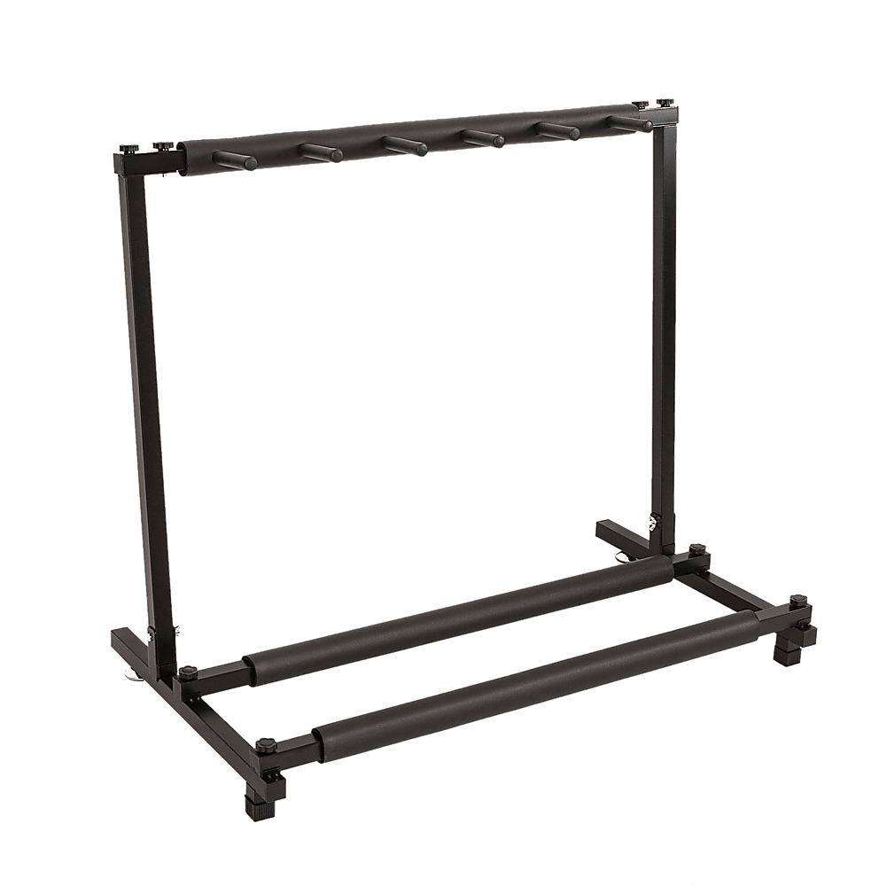The stand itself offers optimal sturdiness and can support the load of up to 5 guitars. Whether you have a mixture of acoustic guitars, bass guitars or electric guitars, the stand is built to support all types. The black neoprene rubber base prevents slippage or scuffing, so you can guarantee your much-loved instruments maintain their condition. The guitars are separated by pegs to avoid them leaning against one another and keep them in standing formation. Accompanied by a durable iron structure, you can rest assured that this guitar-holding stand will withstand the test of time. We understand that, as a musician, you may constantly be hitting the road. That's why the stand is easy to fold into a compact position, ready for transportation.