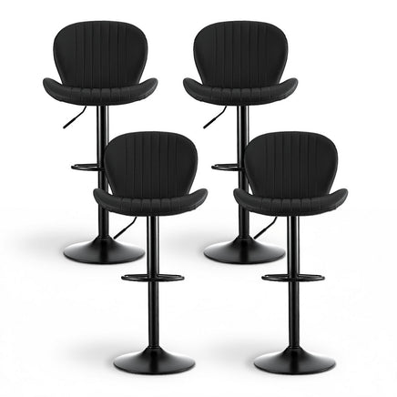 This set of 4 premium bar stools combines modern aesthetics with practical features. Upholstered in black PU leather, the contoured shell-shaped seats with a vertical stripe pattern offer both comfort and style. The adjustable height (95–113cm) makes these stools versatile for various counter or bar setups. Built with a sturdy metal frame, reinforced gas lift cylinder, and 120kg weight capacity per stool, they are designed for durability and stability. Anti-slip floor protectors and a semi-circular footrest ensure safety and comfort, while easy assembly saves you time. Perfect for kitchens, dining areas, or commercial spaces, these stools are a must-have for any modern interior.