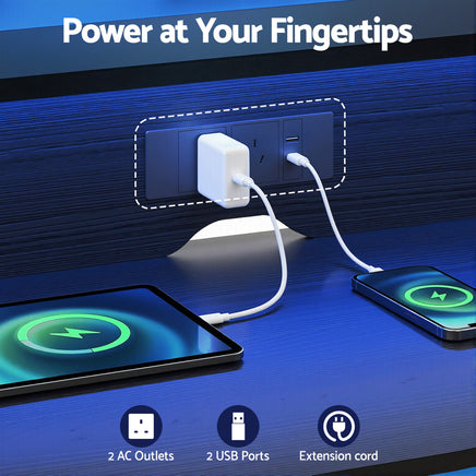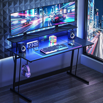 Level up your setup with the Artiss Gaming Desk with LED Lights. This computer desk features built-in power outlets and a gaming table with monitor shelf for ergonomic comfort. A complete LED gaming desk with power outlets, providing a sturdy computer table for work or play.