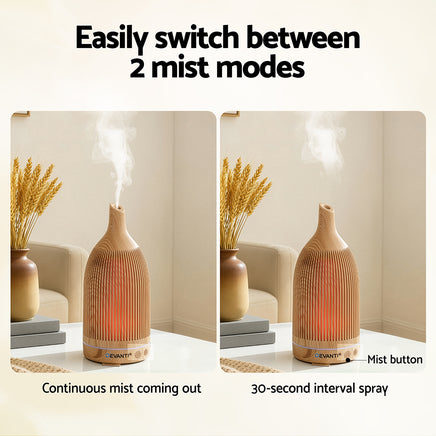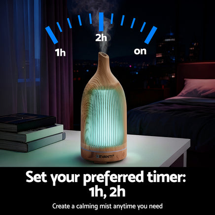 Add a touch of nature to your home with this wood grain aroma diffuser. Featuring a 200ml tank, 2 mist modes, and 2 timer settings, it creates a relaxing atmosphere with your favorite essential oils. Cycle through 7 LED colours with 2 brightness levels to set the perfect mood day or night. Whisper-quiet operation, automatic shut-off when water runs low, and low energy consumption make it safe and convenient for daily use. Perfect for bedrooms, living rooms, offices, or as a thoughtful gift.