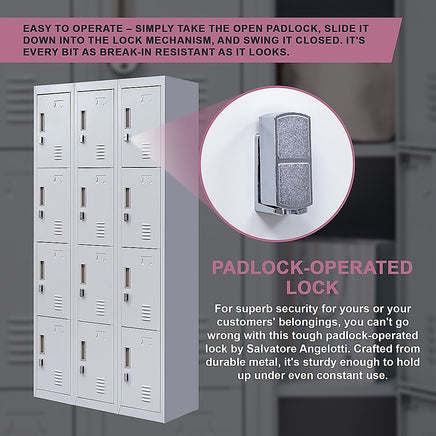 For superb security for yours or your customers' belongings, you can't go wrong with this tough padlock-operated lock by Salvatore Angelotti. Crafted from durable metal, it's sturdy enough to hold up under even constant use. It's easy to operate simply take the open padlock, slide it down into the lock mechanism, and swing it closed. It's every bit as break-in resistant as it looks.