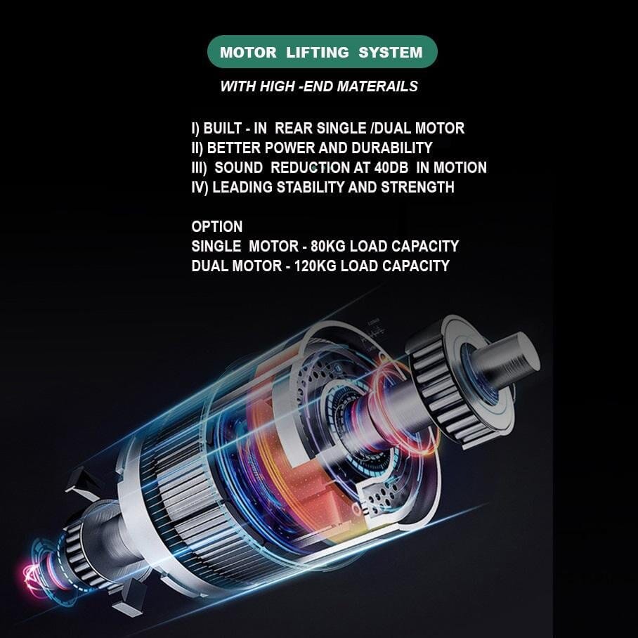 Amazingooh provide selection of single/dual motor lifting system. This translates to fast, smooth and quiet operation, with the added benefit of superior durability and up to 120kg (Dual motor) capacity. Furthermore, unlike other models on the market, the motors are neatly and safely enclosed.