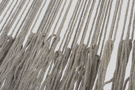 Indulge in pure relaxation with this stunning hand-woven hammock. Crafted with 100% cotton rope in our Dreams Sands catalogue colour, this elegant grey rope hammock is adorned with a luxurious fringe, making it the perfect addition to any space.