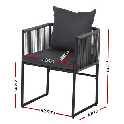 Gardeon Contemporary Outdoor Chairs blend durability and style for indoor or outdoor use. The sturdy powder-coated steel frame ensures long-lasting support, while UV-resistant, weatherproof hand-woven rope forms a comfortable, cocooned seat. Non-slip feet provide stability, and removable, machine-washable cushions offer easy maintenance. Designed for effortless assembly, these minimalist chairs pair perfectly with bistro sets or dining tables, adding modern elegance to any space. Ideal for patios, gardens, or indoor lounging, Gardeon chairs combine robust construction with timeless design for year-round comfort.