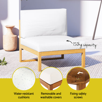 Get outdoors just in time for summer with the Gardeon 4-seater Outdoor Sofa Set. Featuring 3 single sofas, a corner seat and a wide coffee table, there’s plenty of space for the whole family. The set is easy to assemble, and you can easily configure the seating into your perfect outdoor set-up. The set uses solid Acacia wood, while the outdoor cushions feature water-resistant, UV-resistant covers, and a thick 12cm high-density foam core for comfort. The tabletop’s slatted design easily drains during wet weather and has plenty of room to hold your outdoor essentials. Maintenance is as easy as wiping down the furniture, and you can remove the cushion covers for even easier cleaning. So what are you waiting for? Make the most out of the beautiful weather with a Gardeon 4-seater Outdoor Sofa Set.