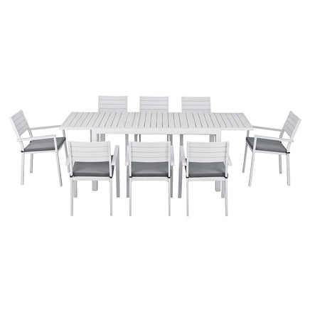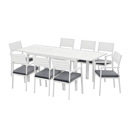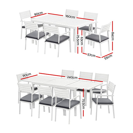 With summer fast approaching, you can once again join the sunshine with the Gardeon 9-piece Outdoor Dining Set. Made from a powder-coated aluminium frame, the set is designed for outdoor or indoor use in a wide range of weather conditions. The table and chairs are designed to comfortably seat 8 people across eight single chairs, or the table can be extended to fit up to twelve (extra chairs not included). The stable structure features fixed safety screws, giving each chair a 150kg weight capacity and a table weight capacity of 50kg. The seats are classically designed and completely comfortable with an inclined backrest, comfortable handrails, and 5cm thick foam cushions. The cushions feature removable and washable covers for easy cleaning. The table and chairs feature a slatted surface for easy drainage during wet weather. With easy and hassle-free assembly, the Gardeon 9-piece Outdoor Dining Set is the perfect addition to any backyard, patio or even sitting room.