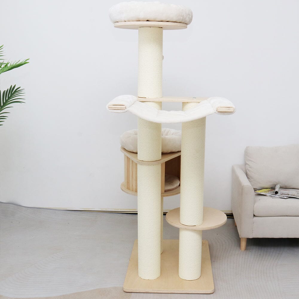 CATIO Solid Wood Cat Climbing Tree Post Scratcher 168cm is a self-assembled cat tree, which is made of strong wood with soft and comfortable items. Cats can all have a place at the same time with comfy perches and dens for them to rest their tired paws. The hideaways are roomy enough for even the biggest felines, complete with large plush beds to lay around on. Sisal wraps the durable posts for a safe scratcher base that will withstand jumping or climbing by really big cats too.