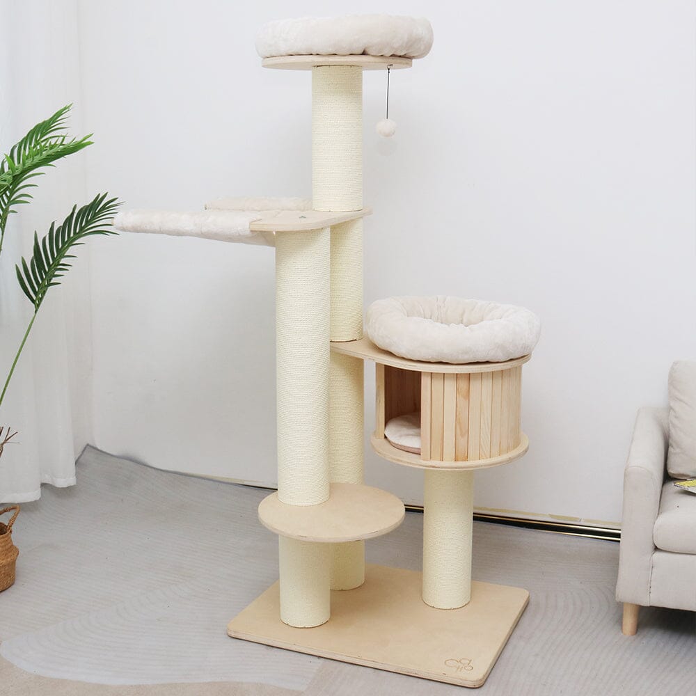 CATIO Solid Wood Cat Climbing Tree Post Scratcher is a versatile cat tree at the same time a cat scratching post. Perfect for cats of all sizes, provides a place to scratch, a place to hide, and a place to rest. Cat furniture that could mix well with your home furniture.
