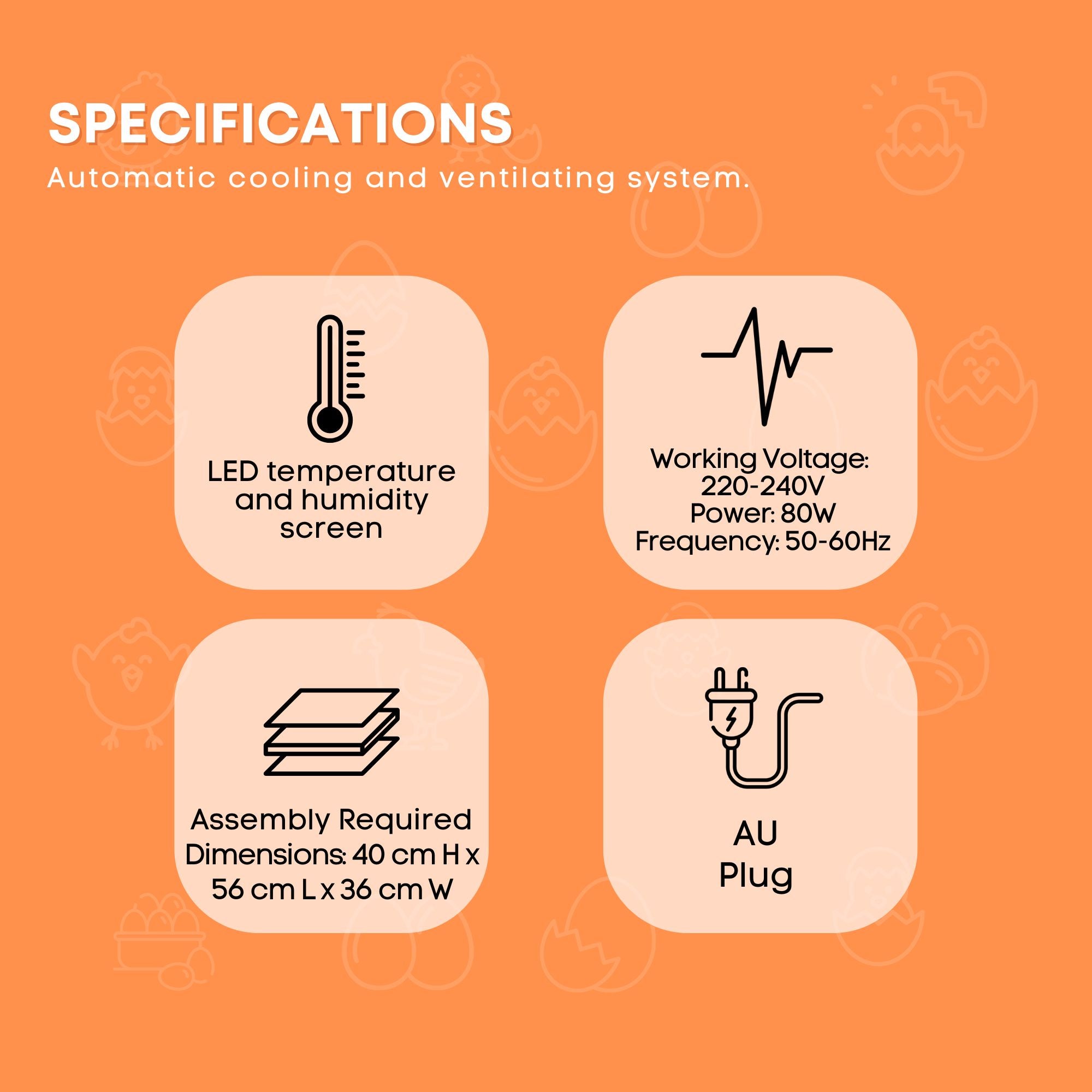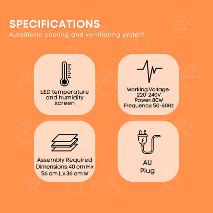 • Egg capacity: 112 chicken/duck/quail (approx.)