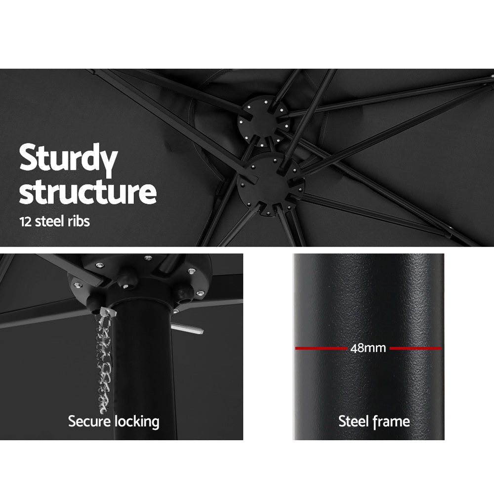 Have you ever tried to share an umbrella? It can be hard trying to fit everyone under one roof. Now you never have to worry about space again thanks to the Instahut Twin Outdoor Umbrella. This extra-large patio umbrella is perfect for summer picnics, BBQs or family beach days, thanks to a 4.57m diameter and double-sided canopy. Made from UV+50, 3-layer, water-resistant and UV-resistant polyester fabric and with the support of 12 steel ribs, the canopy will last you through all kinds of weather, rain or shine. The umbrella is easily operated by hand, using the heavy-duty, fail-safe handle supported by a powder-coated steel pole and durable steel base. Take the umbrella anywhere from the beach to the backyard. Keep it maintained easily by washing with low-pressure water and mild dishwashing soap, and you can easily store it away in a cool, dry place when not in use. So what are you waiting for? Summer isn't going to experience itself go out and enjoy the good times with an Instahut umbrella.
