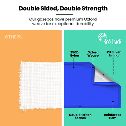 At the heart of the design is Red Track's patented steel-cable reinforced canopy structure, which keeps the roof tight, prevents water from pooling, and adds exceptional wind resilience. Combined with oversized truss bars and square-tube steel legs, this gazebo offers rigidity you can rely on.