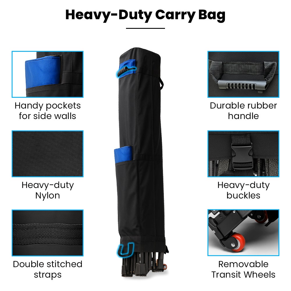 Three detachable 250D side walls provide added shelter from sun, wind and rain, giving you more control and privacy for any setup, and there are four height settings from 1.65 to 1.95m. When the day is done, the frame folds smoothly into the heavy-duty wheeled carry bag for easy transport and storage.