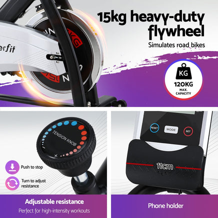 Push your fitness to new heights with the Everfit Spin Bike, engineered for workouts at home. Featuring a strong 15kg flywheel and a silent belt drive system, this bike ensures a smooth and noise-free ride. The adjustable friction resistance lets you tailor your workout intensity, making it suitable for beginners and seasoned athletes alike.