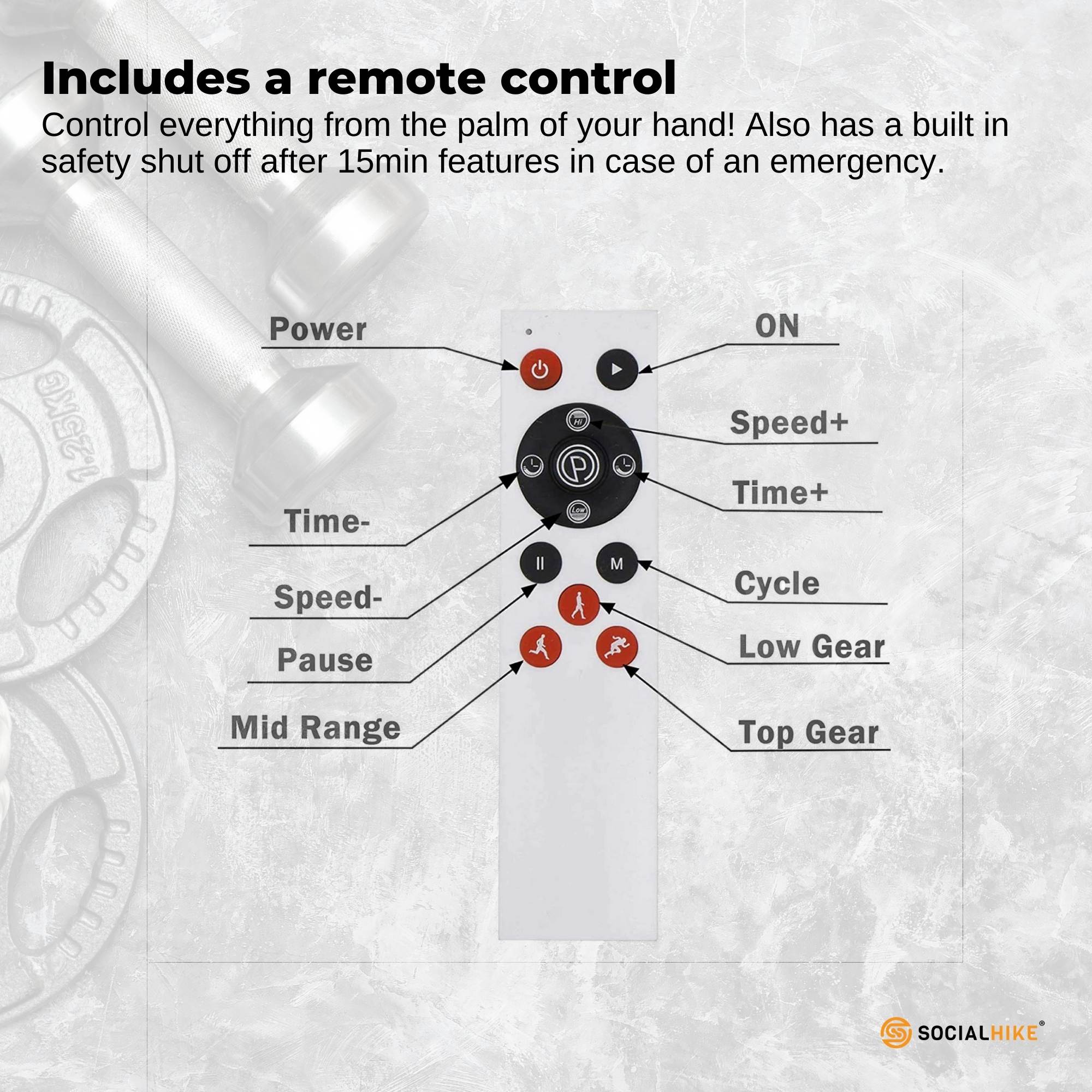 Includes a remote control.This vibration machine automatically shuts off at 15 minutes. This is a safety featuresin case of an emergency. It is recommended that the vibrationplatformshould be used in 15 minuteintervals.