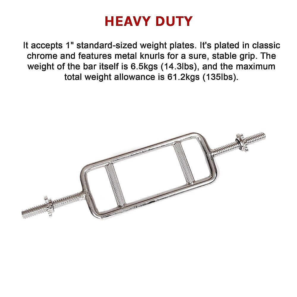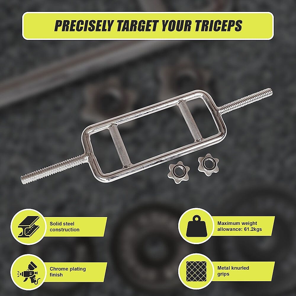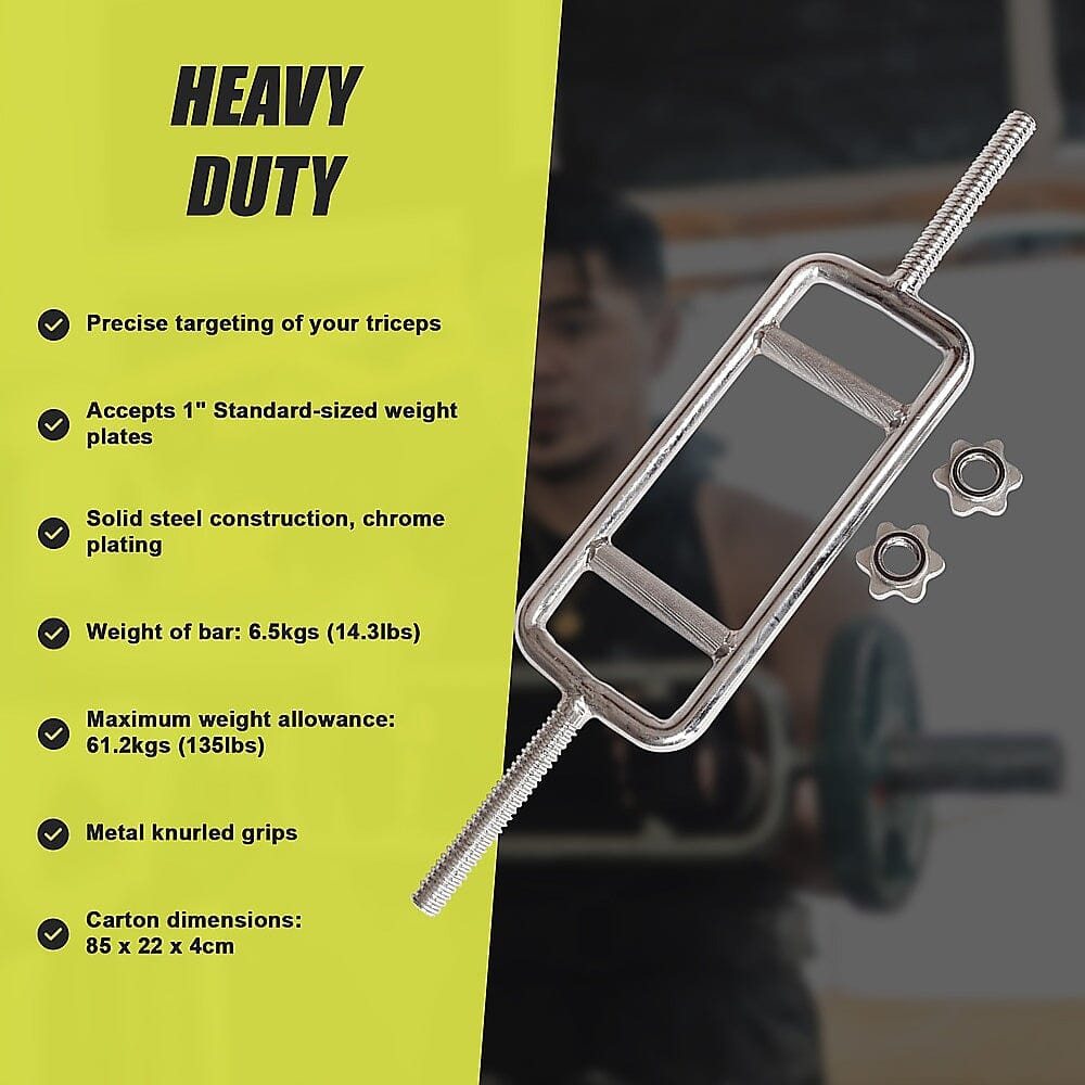This specially-designed bar will precisely target your triceps with a full range of motion while minimising stress on the wrists, forearms and elbows. It accepts 1 standard-sized weight plates. It's plated in classic chrome and features metal knurls for a sure, stable grip. The weight of the bar itself is 6.5kgs (14.3lbs), and the maximum total weight allowance is 61.2kgs (135lbs).