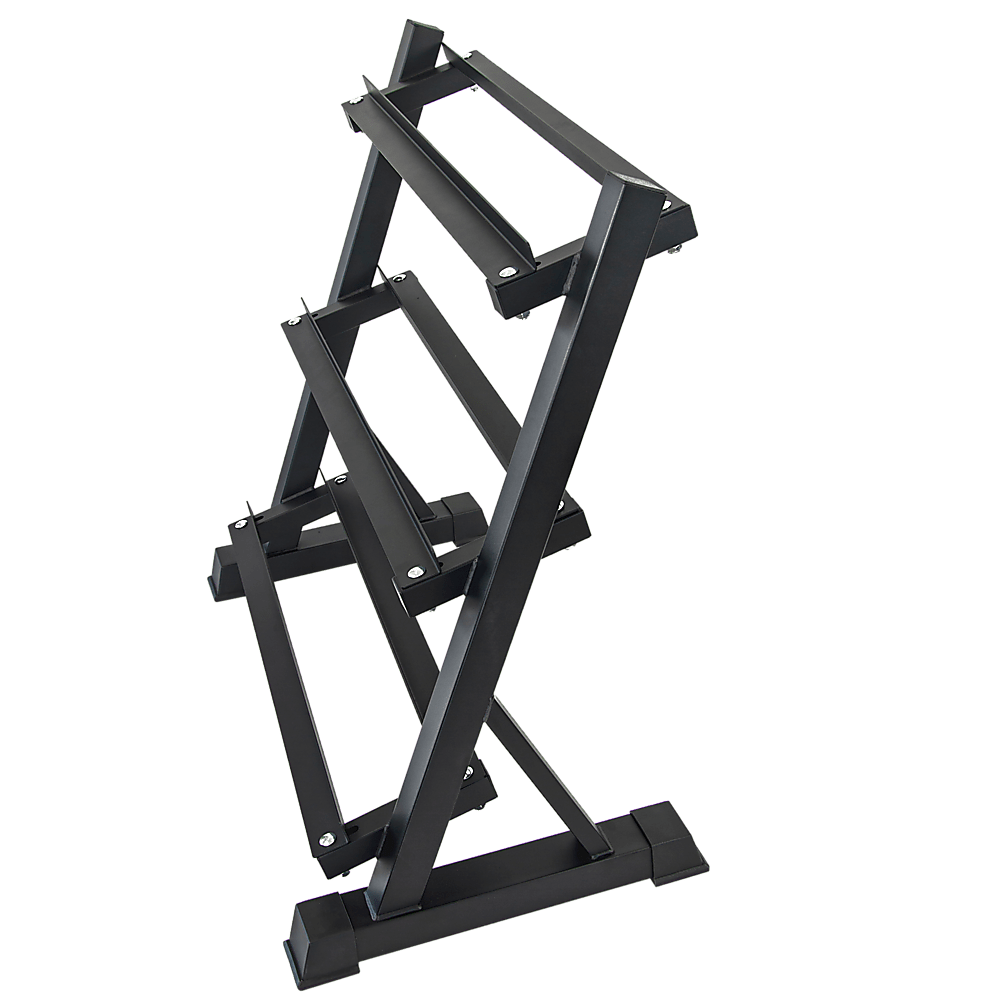 The rack is built to handle up to 300kg and has angled shelves for easy loading of the weights and seamless de-racking. It comes with three tiers so you have enough storage and not have your dumbbelss left lying around.