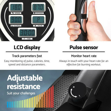 Elliptical cross trainers are excellent fitness machines for individuals who demand a training regime that works on all muscles and yet eliminates the risk of impact injuries such as treadmill running or walking. Hence the trainers are particularly helpful for those with joint problems with knees and feet. Our Everfit Elliptical Bike is a very efficient low-impact cross trainer that offers adjustable mechanical resistance to tone every muscle in your body. The easy-to-read LCD display lets you keep track of your training parameters. The industrial-strength powder-coated steel frame is strong and sturdy and the large seat is comfortable with every stride. Other great features include built-in pulse sensors, rubber-clad pole grips, reversible two-way movement, mode changes within 30 seconds and adjustable handlebar height and seat. Not least, the elliptical bike allows you to exercise whenever you want, anytime and anywhere.