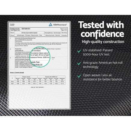 Bounce to your heart's content with the Trampoline. With its superior bounce characteristics featuring 48-piece triple rate springs, the 8-foot Trampoline enables safe and durable bouncing with no worries. The heavy-gauge steel framework is designed to handle all robust play and is UV-tested for quality and reliability. Other great features include a curve design for more rigidness, 20mm thick padding, anti-graze mat, safety netting and a double-lock zip-and-clip entry. So jump to it and order the Trampoline today.