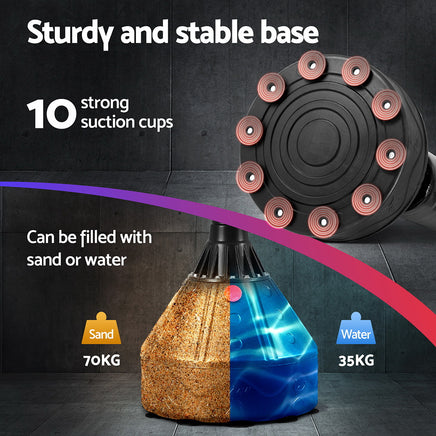 Get your daily boxing routine done in style and convenience with the Everfit Boxing Bag Stand. Made from sturdy multi-layered material, the boxing bag and stand are designed to absorb whatever you throw at it, giving you a real workout. The thick and sturdy base keeps the bag in one place and prevents tipping. It can be secured with 10 strong suction cups, and you can fill the base with water or sand to guarantee stability. The reinforced shock absorption system ensures reduced vibration and quiet operation, so you can exercise in comfort and quiet. The high rebound bag easily returns to its original position after punching and gives you a range of movement to practice with. Easy to install and easy to maintain, the Everfit Boxing Bag Stand will help relieve stress, improve your physical defence and keep you fit.