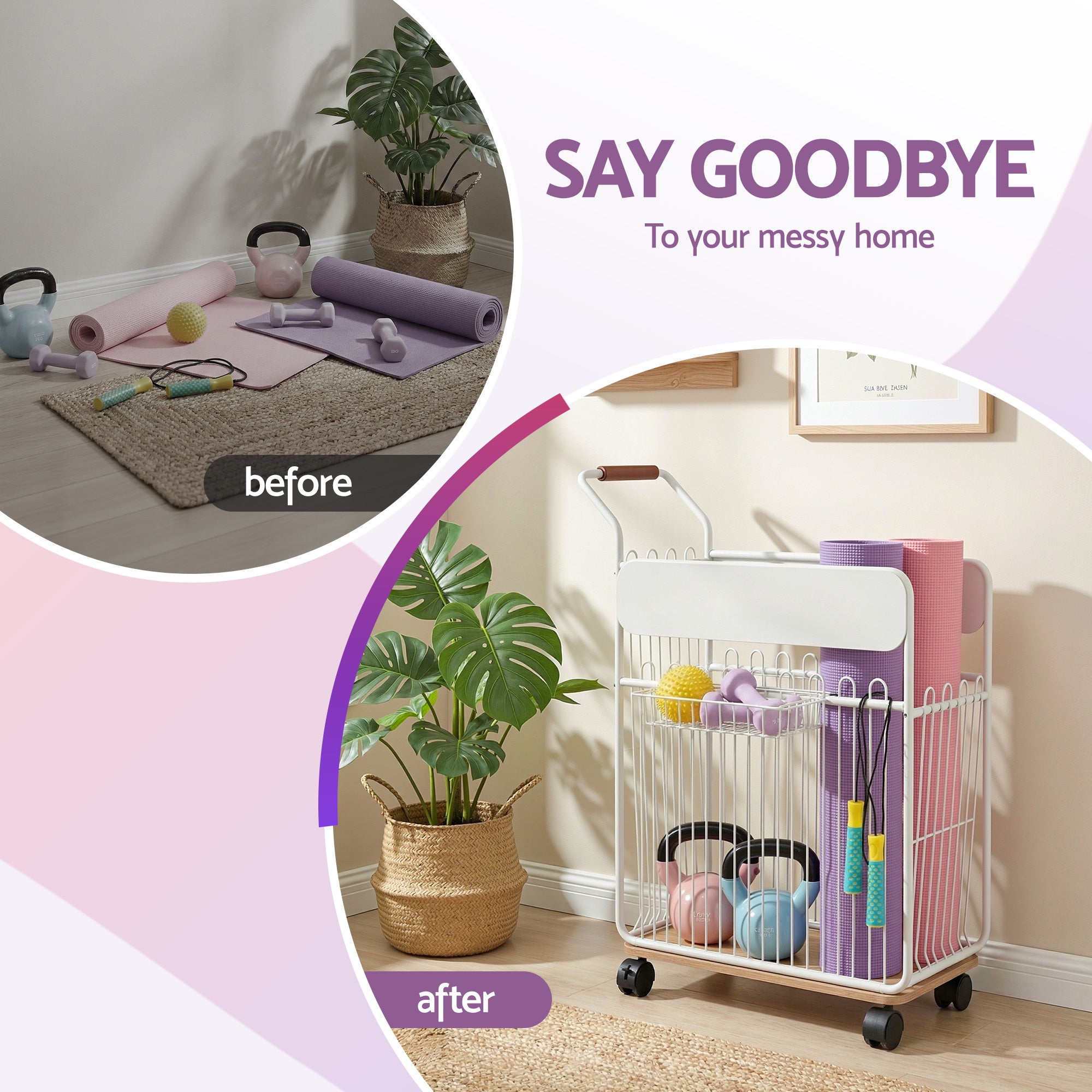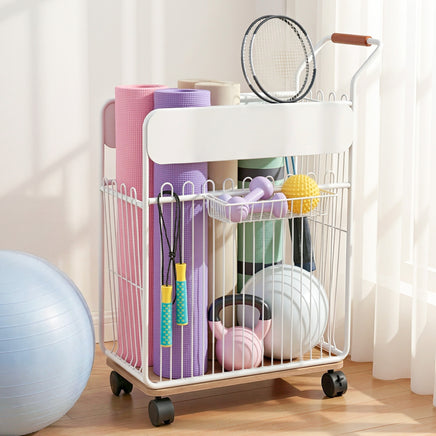 Tidy your fitness gear with the Everfit Mobile Yoga Mat Storage Rack. This versatile organiser features locking wheels to move effortlessly from room to room. It comes with movable hooks and a storage basket to hold your mat, blocks, bands, and small accessories in one dedicated spot. Its Scandinavian-inspired design with a white frame and wood accents looks more like stylish furniture than a simple storage bin. By storing items vertically, it frees up floor space, making it perfect for home gyms and small living areas.