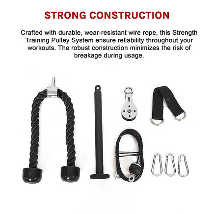 Crafted with durable, wear-resistant wire rope, this Strength Training Pulley System ensure reliability throughout your workouts. The robust construction minimizes the risk of breakage during usage.