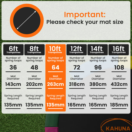 Disclaimer: These replacement parts are specifically designed to fit Kahuna trampolines and may not be compatible with other brands or models.