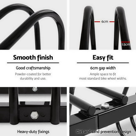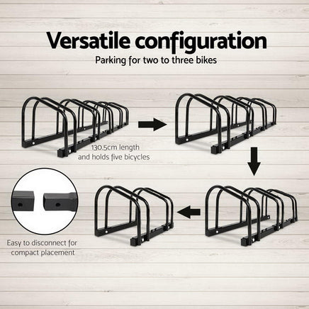 The bike parking rack can securely store up to five bikes side by side and is entirely freestanding. Additionally, the stand can be reconfigured into any vairation of five and can be installed in numerous locations. The bike rack is constructed with high quality powder coated steel with a smooth finish to prevent scratches.
