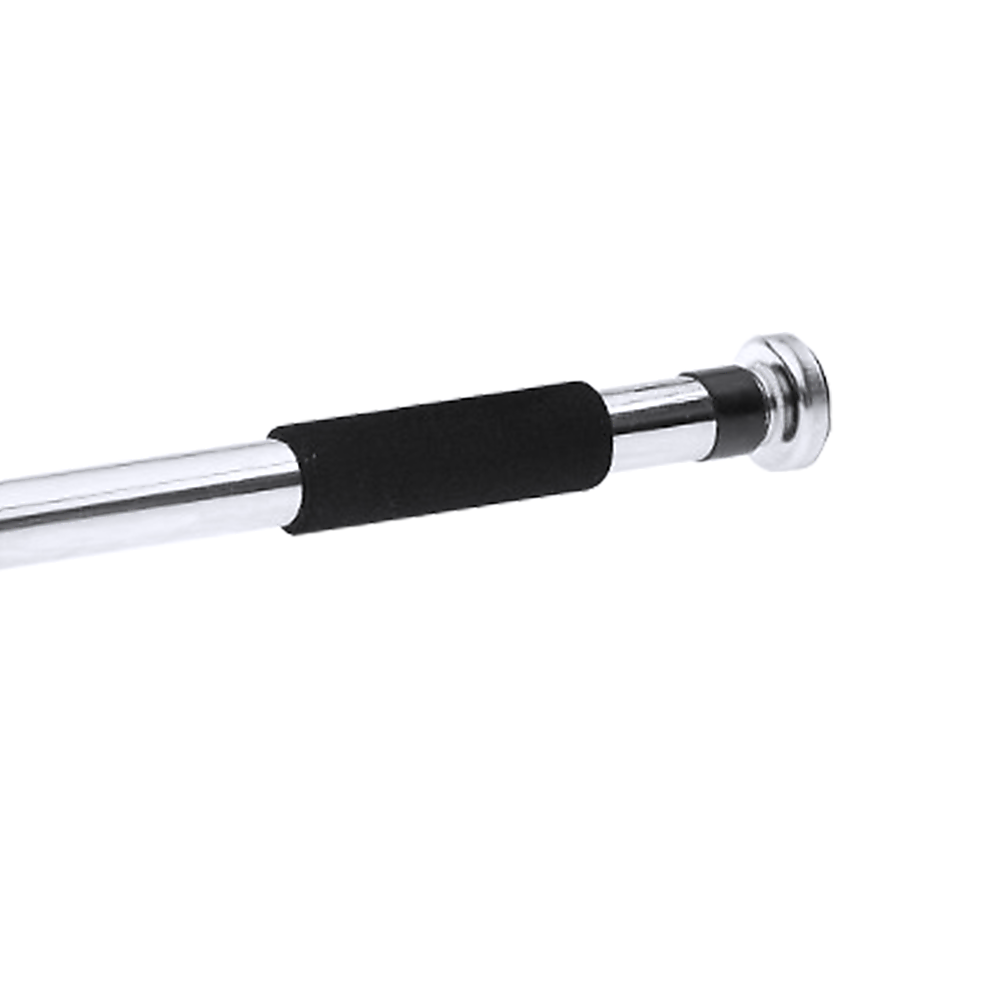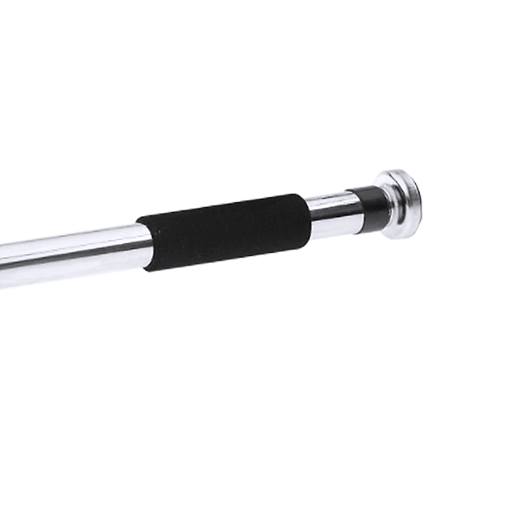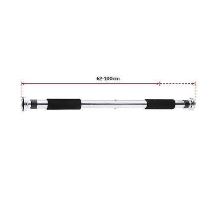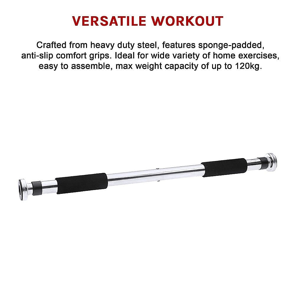 The heavy-duty steel chin-up bar is ready to go right out of the package. Just hold it in the doorway and twist either side until the arms extend for a tight, firm fit. There are also screw holes to make the installation permanent. Comfort grips make both overhand and underhand grip positions possible. The bar is rated to support persons up to 120kg.