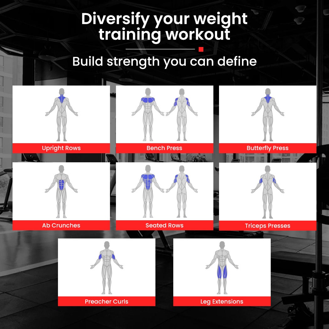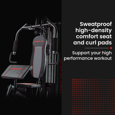 The Proflex M8000 offers a complete home workout solution, allowing you to train every major muscle group with ease. With multiple stations - including chest press, leg extension and curl, butterfly, preacher curl, lat pulldown, and seated row - you can enjoy a varied and balanced strength routine from the comfort of your own home.
