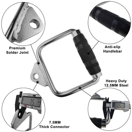 Elevate your strength training with thispremium solid D-handle cable attachment, engineered for durability, comfort, and maximum performance in any home or commercial gym setting. Crafted from high-grade 12.5mm thick steel, this heavy-duty handle is built to withstand intense workouts and long-term use without bending or breaking. The polished chrome finish not only resists corrosion but also adds a sleek, professional look to your fitness setup. Designed to connect seamlessly to most cable machines, Smith machines, and pulley systems, it expands your workout versatilityperfect for lat pulldowns, triceps pushdowns, bicep curls, shoulder presses, and more. The ergonomic black rubber grip features a knurled texture that enhances control and prevents slipping, even during sweaty sessions. A reinforced welded joint ensures secure attachment to the cable, while the included carabiner clip allows quick, tool-free connection and disconnection. Whether you're building muscle, improving endurance, or refining technique, this D-handle delivers reliable support and superior gripmaking every rep count.